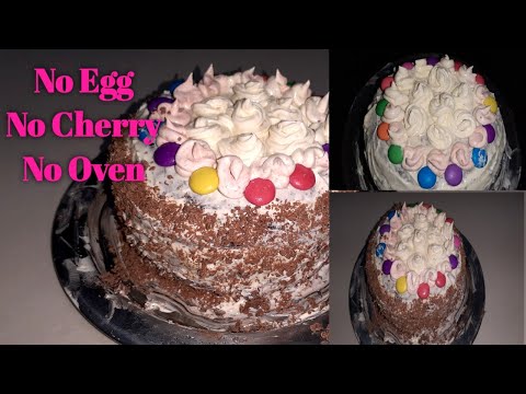 Black Forest Cake, Eggless, Made in pan. Eggless Baking without Oven , with out cherry . Layers of Chocolate cake, Whipped Cream and sugar syrup stacked and covered with whipped cream and decorated with gems and shredded chocolate. Its an tasty cake which kids would ask for more !!
